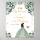 Ce panneau de bienvenue élégant et glamour pour la fête d'anniversaire présente une belle princesse à la peau foncée dans une robe de boule verte sage. Le texte combine écriture manuscrite et polices sans serif modernes pour un look élégant et sophistiqué. Les arrangements floraux, papillons et confettis d'or créent un mélange parfait de rustique et de chic. Graphiques par www.etsy.com/uk/shop/SunflowerDayLove