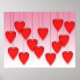 Coeurs brillants rouges accrochés aux cordes sur un arrière - plan rose et blanc - parfait comme une affiche de la Saint Valentin!