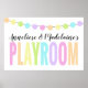 Cette adorable affiche est décorée de "PLAYROOM" et d'une guirlande de pom pom dans un style pastel, arc-en-ciel. Personnalisez avec le nom de votre enfant/enfant. Découvrez nos jeux de couleurs et de coordination dans notre collection d'imprimantes de pépinière et de salle de jeu.