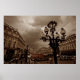 Image d'inspiration sépia, à l'architecture typiquement française des côtés gauche et droit de l'image, avec circulation autour de l'opéra parisien, l'Opéra national de Paris sur la place de l'Opéra dans ce 9e arrondissement. Les tons marron rouge du camion rétro peuvent être vus en traversant l'intersection. La lampe de rue classique iconique est bien visible au premier plan de l'image