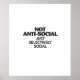 A bold, monochromatic typographic statement in a dark, minimalist style. The text reads: "NOT ANTI-SOCIAL JUST SELECTIVELY SOCIAL" using a clean, heavy-weight font. The subtle contrast of dark grey on black creates an understated, cool, and mysterious aesthetic, perfectly reflecting the sentiment of the quote. This design is ideal for introverts, individuals who value their personal space, or anyone making a clear, unapologetic statement about their social preferences. Excellent for modern apparel and prints.