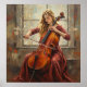 Une jeune femme blonde en robe rouge fluide joue du violoncelle avec grâce près d'une fenêtre ensoleillée, capturée dans des coups de pinceau doux et impressionnistes évoquant une élégance intemporelle et une passion musicale.