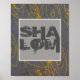This quote poster has text Shalom for wall art decor in a bold contemporary style yellow and grey abstract design. Original artwork Ann Powell