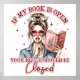 Illustration de charme montrant une femme avec son doigt sur ses lèvres tenant un livre ouvert. Le texte coloré dit : "Si mon livre est ouvert, votre bouche devrait être fermée". Ce design est disponible sur une grande variété de produits.