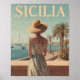 This beautiful vintage poster captures a stylish woman in a classic 1950s dress walking along a sunny Sicilian promenade. With views of the Mediterranean Sea, charming coastal architecture, and hints of palm trees or distant hills, the artwork blends timeless fashion with the romantic spirit of mid-century Sicily. Rendered in warm, nostalgic tones, this piece is perfect for admirers of vintage travel, Italian charm, and elegant retro aesthetics.