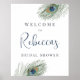 Un signe de bienvenue boho chic conçu pour correspondre à nos invitations de fête de mariage à thème plume de paon aquarelle, avec une paire de plumes de paon encadrant votre texte personnalisé dans des nuances élégantes d'indigo.