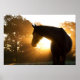 Silhouette de cheval contre un coup de soleil à travers les arbres et la brume, créant une image magique avec une sensation éthérée