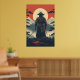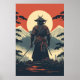 Silhouette d'un guerrier samouraï avec la lune, les montagnes et les arbres.