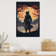 Silhouette d'un guerrier samouraï avec la lune, les montagnes et les arbres en fleurs.