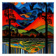 A.I. assisted print of the darkened shape of a bird in flight above a landscape of colourful hills and mountains framed by two tree silhouettes.
