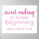Playful 1980s inspiré ultra brillant bubblegum rose et fuchsia rose fleurissent calligraphie horizontale "Sweet Ending to New Beginning" douche, fête, ou la table de réception signage avec un script amusant, décontracté écrit à la main. Le design classique comprend une superposition de la typographie de citation à la main moderne. La belle police avec une couleur arrière - plan personnalisable permet de s'adapter facilement à n'importe quel thème. Pour d'autres couleurs ou produits correspondants, veuillez visiter le magasin JustFharryn Zazzle, ou contacter le concepteur, c/o fharryn@yahoo.com Tous droits réservés. #zazzlemade