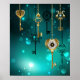 Or, clés antiques avec engrenages et cadrans accrochés sur chaînes dorées sur arrière - plan vert lumineux.