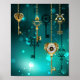 Or, clés antiques avec engrenages et cadrans accrochés sur chaînes dorées sur arrière - plan vert lumineux.
