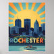 Illustration stylisée de la ligne d'horizon de Rochester, New York baignée par la lumière chaude d'un soleil couchant avec un bateau sur la rivière.