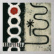 Un tableau abstrait avec une ligne incurvée en bas à droite, comme un parcours de slalom, puis un astérisque attaché à lui, et à gauche, une chaîne blanche avec accent rouge et de petites bandes noires et blanches en bas.