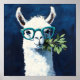 Playful twist to cute animal art and humor with a quirky white llama rocking teal glasses and holding a leafy branch.