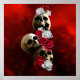 Smell the Roses (while you can). Textured white skulls with red and white roses on a textured red backgound