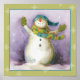 © Lisa Audit / Wild Apple. Ce bonhomme de neige de vacances porte des mitaines d'hiver et une écharpe verte avec des pois. L'image est bordée de flocons de neige le long des côtés.