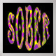 Des lettres stylisées violettes, roses, jaunes et vertes forment le mot Sober dans ce graphique rétro inspiré des années 60