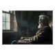 Portrait photographique d'un vieil homme aux cheveux blancs et à la barbe bien découpée, assis seul dans un fauteuil en cuir marron foncé. Il regarde avec nostalgie par une fenêtre voisine, illuminée par une lumière naturelle douce qui met en valeur son profil et des poussières dans l'air. La chambre qui l'entoure est cosy mais peu éclairée, évoquant la mélancolie et l'introspection. Un livre fermé se trouve à proximité, mettant l'accent sur la contemplation tranquille et la solitude.