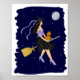 Sorcière volant sur un balai avec son chat orange sur une pleine lune. Belle illustration pour les amateurs de sorcières. Décor d'art parfait pour ce mois d'octobre. C'est une illustration de sorcière pour les gens qui se sentent sorciers cet Halloween.