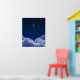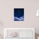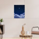 Une affiche d'étoile brillante blanche scintillante haut dans le ciel nocturne sombre sur un coussin de nuages blancs moelleux en dessous.