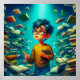 Odyssée de livres d'un garçon perdu dans la mer de la connaissance, surfant les vagues de la sagesse! Perdu dans une mer de livres, un garçon avec lunettes est grand, embrassant les merveilles de la connaissance et de l'apprentissage.