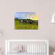 Cette affiche présente une rangée de bétail noir et blanc du parc du Speckle, debout derrière une clôture en fil de fer barbelé avec des mauvaises herbes jaune vif au premier plan et un ciel gris en partie turbulent mélangé avec le soleil couchant derrière. Ce serait une parfaite pop de couleur où que vous l'affichez.
