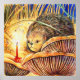 Affiche fantaisiste d'un hérisson lisant à la lueur des bougies parmi les champignons. Belle photo d'imaginaire pour les enfants qui aiment les animaux et les hérissons en particulier.