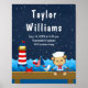 Un adorable petit singe marin assis sur un pont en bois avec une mouette et un crabe. Dans l'arrière - plan il y a un phare rouge et blanc, un oiseau mignon sur un voilier, des vagues de l'océan et un ciel étoilé bleu marine. Graphiques par PixelPaperPrints et DigitalCurio