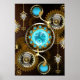 Turquoise lenses with antique watch with brass gears and golden keys on rusty, brown background. Steampunk style.