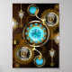 Turquoise lenses with antique watch with brass gears and golden keys on rusty, brown background. Steampunk style.