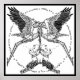 Fantastique illustration de Dugald Stewart Walker du livre pour enfants "Fairy Tales from Hans Christian Andersen", publié en 1914. Dessin noir et blanc de deux cigognes en vol, leurs cous croisés, portant deux bébés satyres, entourés d'un anneau d'étoiles. Extrait de l'article "The Flying Trunk".