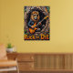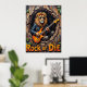 Cette oeuvre d'art captivante représente un lion, qui a l'air sans effort cool dans les lunettes de soleil et une veste en cuir, livrant des "fûts primaires" sur une guitare électrique de l'intérieur d'un arbre texturé creux. Les éléments naturels de la forêt encadrent subtilement la scène, tandis que le message "Rocher ou Mourir" proéminent renforce l'énergie brute. L'impasto épais et expressif crée une texture tangible, faisant résonner la passion du lion pour la musique