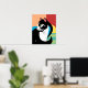 Black and white cat art with a colorful geometric background