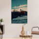Transform your living room, bedroom, or cozy cabin retreat with the serene and nostalgic atmosphere of this winter landscape poster. This vertical artwork showcases a beautifully stylized, painterly view of a snow-covered rooftop and sturdy wooden fence, contrasted against a breathtaking teal blue sky. The distinct shading and flat colors evoke the classic, highly sought-after aesthetic of vintage travel posters.
