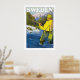 Affiche de voyage vintage pour la Suède montrant un pêcheur en plein air.