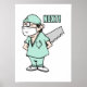 Un dessin d'un chirurgien tenant une grande main a vu derrière son dos en criant "SUIVANT !"