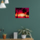 A bold and vivid sunset looking out over the water with palm trees and the glimmer of the sun in shades of yellow, red, and orange. A sailboat sails peacefully on the glistening ocean.