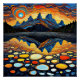 A.I. assisted print of a bizarre sunset reflecting on the surface of the lake in swirls and spots as it descends to the horizon behind a distant mountain range.
