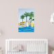 Surfboards sur une plage tropicale avec des affiches de palmiers, représentant un paysage tropical. Palmiers et planches de surf sont installés sur le sable et les vagues bleues. Il s'agit d'un modèle et vous pouvez ajouter votre texte ou le customiser pour modifier l'image, le texte, la police, la couleur. Jeu de couleurs : Bleu, vert, blanc, jaune, bronzé