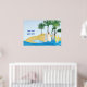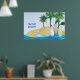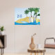 Surfboards sur une plage tropicale avec des affiches de palmiers, représentant un paysage tropical. Palmiers et planches de surf sont installés sur le sable et les vagues bleues. Il s'agit d'un modèle et vous pouvez ajouter votre texte ou le customiser pour modifier l'image, le texte, la police, la couleur. Jeu de couleurs : Bleu, vert, blanc, jaune, bronzé