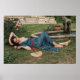 “Sweet Summer” by John William Waterhouse captures a quiet, sun warmed pause in a garden setting. A young woman reclines on the grass beside a stone fountain, her loose blue dress gathered with a red sash as rose blossoms drift around her like soft punctuation. The scene feels hushed and intimate, as if time has slowed to let the season breathe.