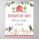 Ce joli panneau sera un grand complément à votre décor de fête. Placez le panneau et affichez-le à votre table de boissons. Le design comprend des animaux de ferme aquarellés avec de la verdure, des confettis colorés et une bordure en vichy rouge.