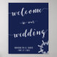 Nautique bleu marine panneau d'accueil de mariage imprimé avec roue blanche et texte personnalisable - vous pouvez ajouter le nom de la mariée et du marié et la date du mariage. Les dimensions de l'affiche sont de 11 pouces sur 14 pouces.