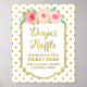 Poster en raphia de couche pour baby shower en points blancs et dorés motif avec bordure d'or, fleurs couleur rose rustique et pêche et lettrage de style manuscrit.