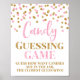 Candy devinez le poster de jeu pour le baby shower en rose clair et motif confetti or. Veuillez noter que l'effet de parties scintillant n'est que photographique.