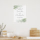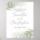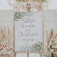 Une signalétique de mariage moderne et élégante avec un script noir simple et élégant écrit à la main sur un arrière - plan blanc avec ajout de verdure tropicale. Customisez avec vos détails uniques.