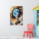 Un loup blanc majestueux hurle sur la lune, baigné d'une lumière dorée, sur fond de nuages tourbillonnants et de corps célestes. Le loup se dresse sur un affleurement rocheux, sa silhouette encadrée par le croissant de lune.