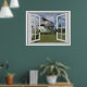Poster avec dinosaure T-rex, fausse scène de fenêtre, pour une pièce sans fenêtre ou un mur de bureau. Illusion d'optique réaliste et amusante affiche pittoresque pour un bureau ou un mur d'étude.